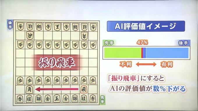 様々な取り組みでファンの裾野を広げる将棋界ですが、叡王戦では互いの戦法も見どころです。岡山市在住の菅井八段は、序盤に飛車を横に動かす「振り飛車」を得意としているのですが、この戦法、AIの分析では、コマを横に動かすことで1手損をしているとみなしているようで、動かした瞬間に数%ほど勝率が下がるんです。
