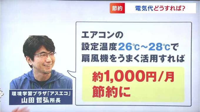 環境学習プラザ「アスエコ」の山田さんによりますと、設定温度を26~28度にして扇風機を上手く活用することで、「1か月で約1000円節約できる」ということです。