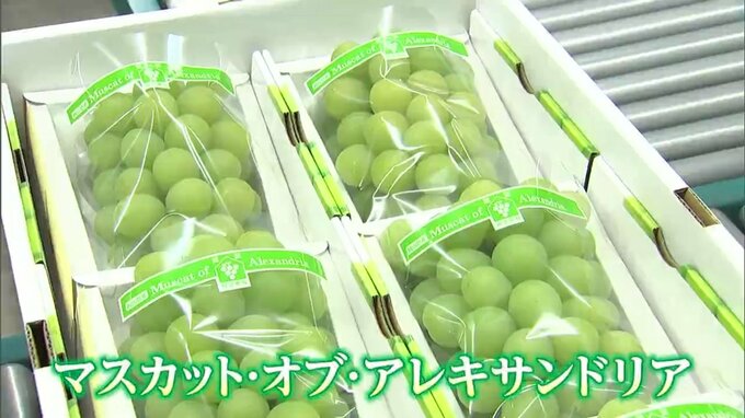 選果場には、加温栽培されたマスカットが並び、形や大きさなどをから等級がつけられます。今年は成熟前の天候に恵まれたことで、香りがよく糖度の高いものになったということです。