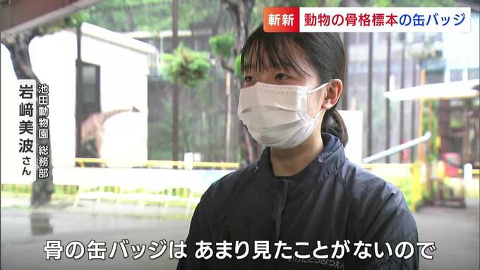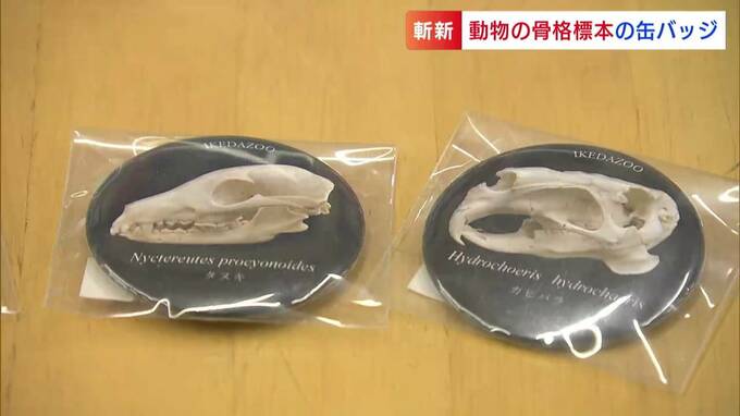 動物の頭蓋骨がプリントされた、大きさ5.5センチの缶バッジです。5月7日に池田動物園で販売が始まりました。