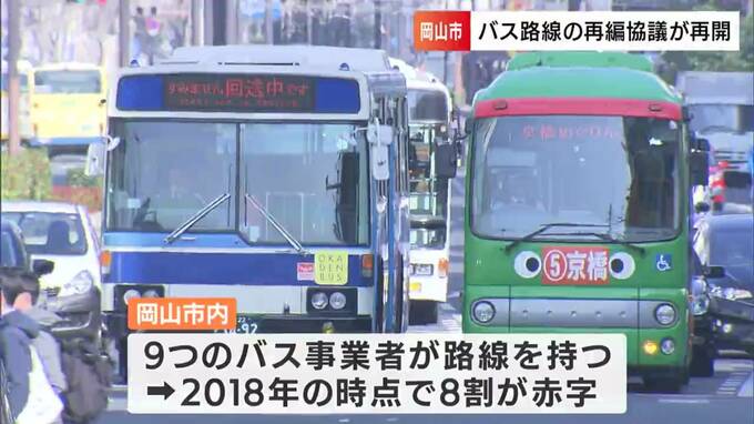 岡山市内には全国的にも多い9つのバス事業者が路線を持っていて、過当競争などの結果、コロナ禍前でも8割が赤字となっていました。