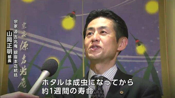 (宗家源吉兆庵 銀座本店統括 山岡正明部長)「ホタルは成虫になってから、約1週間の寿命と短い期間となっております。その短い期間で精いっぱい光を放つイルミネーションをぜひとも皆さんに楽しんでいただければ」