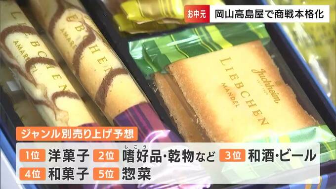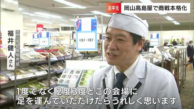 今年は、新型コロナ5類移行で店頭への来客の増加を見込み、売り上げ目標を昨年の3.5%増に、また1人当たりの購買価格は2万円~3万円と予想しています。岡山高島屋の中元特設売り場は、来月25日まで開設されています。