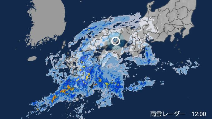 【画像①~⑭】は、8日正午~9日午前0時までの、1時間おきの雨雲レーダーです。◎印はRSK山陽放送がある岡山市北区です。