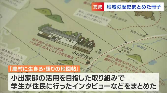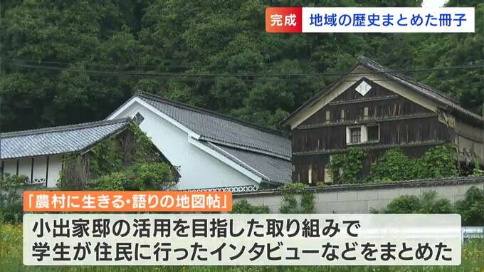 活動に協力した住民らを前に、岡山県立大学の学生が冊子の完成を報告しました。約20年前から空き家となっている江戸時代の大庄屋・小出家(こいでけ)邸の活用を目指し、3年前に始まったプロジェクトで、学生が地元住民に地区に活気があった頃のことをインタビューしてまとめていて、きょうは地元住民らに1000冊が贈呈されました。