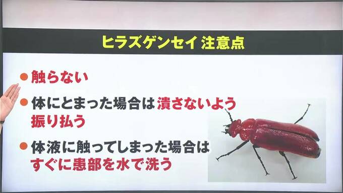 触ると水ぶくれなどの症状を引き起こすおそれがある昆虫が、岡山市中心部の住宅街で見つかりました。その名は「ヒラズゲンセイ」。もともと四国などが主な生息域でしたが、近年広がっているといいます。