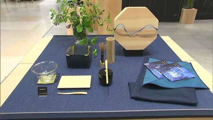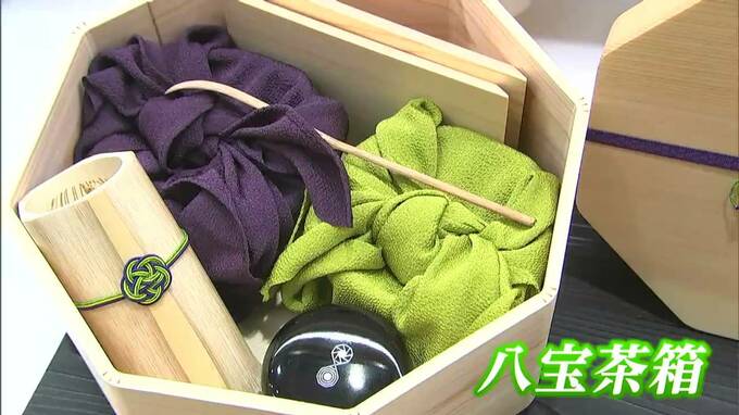 茶箱としては珍しい八角形で、箱の中には8人の職人が制作した茶碗や茶筒などが納められています。この「八宝茶箱」は倉敷市の建築会社が去年から手がけているもので、今回初めて制作された「倉敷仕様」のセットは、倉敷ガラスの器のほか、風呂敷には地元産のデニム使用しています。