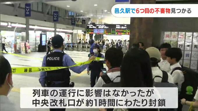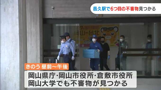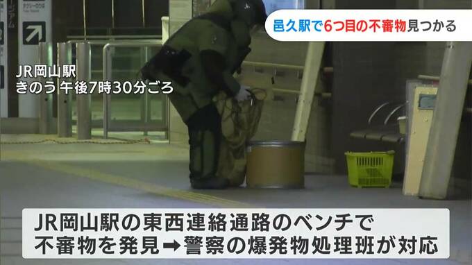 きのう(19日)から岡山県内で相次いでいる不審物についてです。昨夜、JR岡山駅で5つ目の不審な箱が発見されたのに続ききょう(20日)、新たにJR赤穂線の邑久駅で6つ目が見つかりました。いずれも、爆発物などではありませんでしたが、警察が威力業務妨害などの疑いで捜査を進めています。
