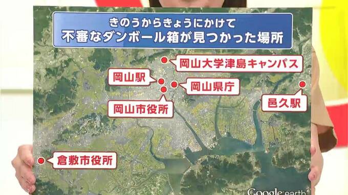 岡山県内ではきのう(19日)から岡山県庁、岡山市役所、倉敷市役所、岡山大学津島キャンパスでも同様の不審な箱が見つかっていて、これで不審な箱はあわせて6つ発見されています。