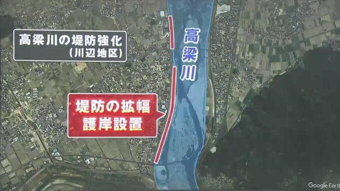 また高梁川の堤防の強化が川辺地区でも行われています。約2キロの区間で堤防の拡幅や護岸設置などを実施する計画で、今後は堤防のかさ上げなども予定されています。