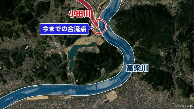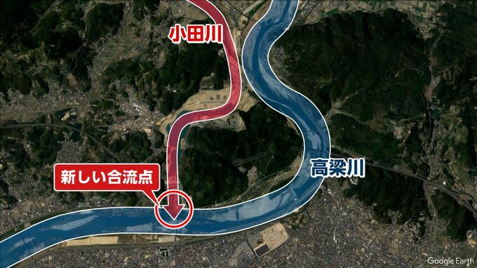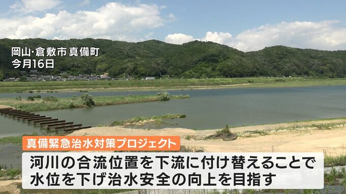 この工事は、「真備緊急治水対策プロジェクト」として行われていて、2つの河川の合流位置を約4.6キロ下流に付け替えることで水位を下げ、小田川沿いの地域と倉敷市街地の治水安全の向上をめざすものです。