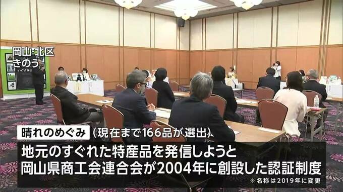 「地元の優れた特産品を地域ブランドとして発信しよう」と、岡山県商工会連合会が2004年から始めた認証制度「晴れのめぐみ」。今年度の新たな商品を決める審査会場には、審査員ら約30人が集まり、7つの事業者から食品や衣料品など11の商品が出品されました。
