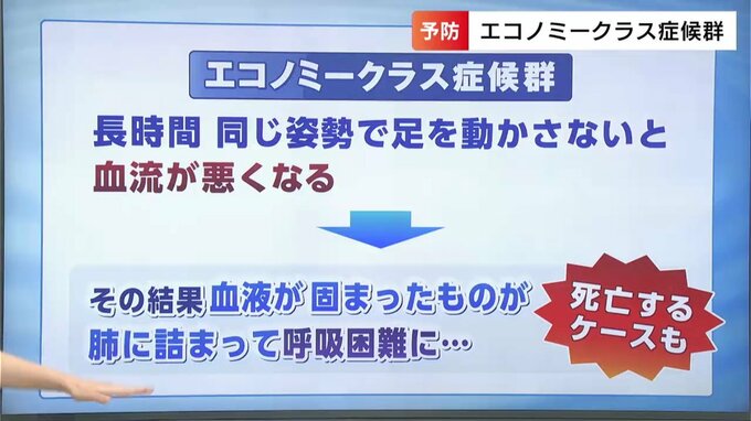 エコノミークラス症候群とは、航空機のエコノミークラスなど体を動かしにくい状況で発症しやすいことから名づけられた症状で、長時間同じ姿勢で足を動かさないと血流が悪くなり、その結果、血液が固まったものが肺に詰まって死亡することもあるんです。