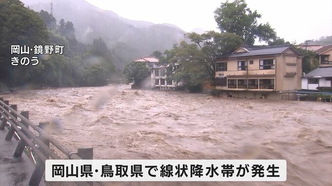 きのう(15日)発生した線状降水帯の影響で、奥津温泉のそばを流れる吉井川の上流付近は大雨となりました。