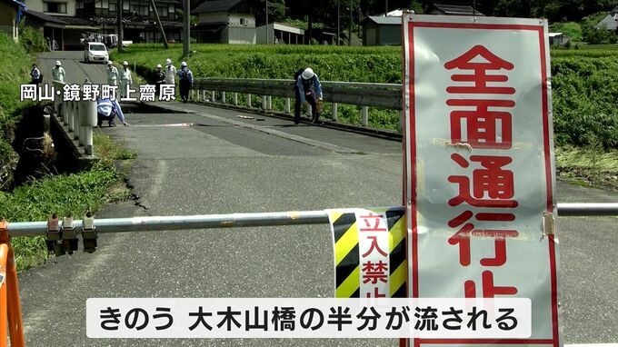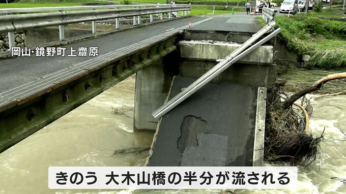 河川の増水で鏡野町上齋原の吉井川に架かる橋の半分が流されました。
