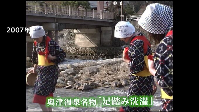 この河原は、小唄にあわせて洗濯物を足で踏んで洗う奥津温泉名物の「足踏み洗濯」が行われる場所ですが、川の増水で景色が一変しました。