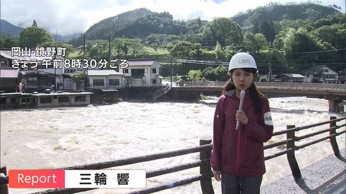 (三輪響記者リポート)「一夜開けた奥津温泉です。茶色く濁った水が激しい勢いで流れています。」