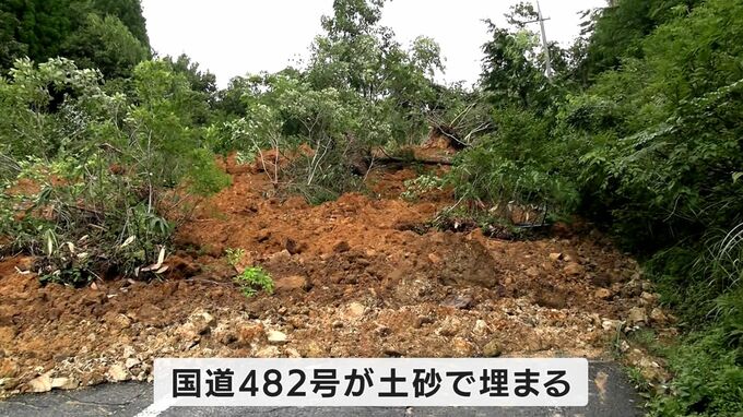 鏡野町と鳥取県とを結ぶ国道482号は、埋め尽くされた土砂により通行止めに。