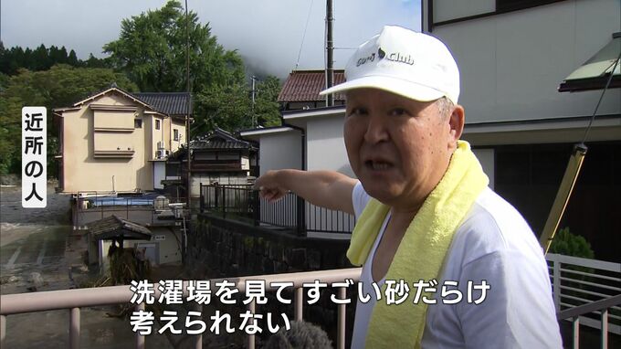 (三輪響記者リポート)「きのうまであちらの足踏み洗濯場に設置されていた屋根と支柱がなくなっていて、流されたと思われます」