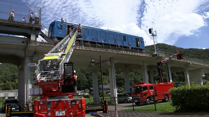 訓練には、地元の井原地区消防組合とともに「県下相互応援協定」に基づいて倉敷市消防局も初めて参加し、高さ9メートルの高架からはしご車を使って乗客を救出しました。