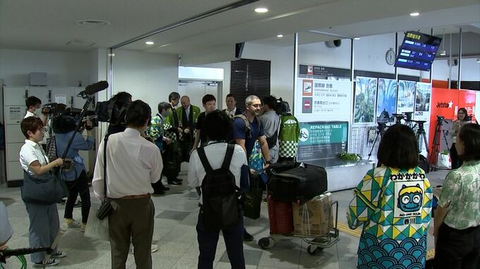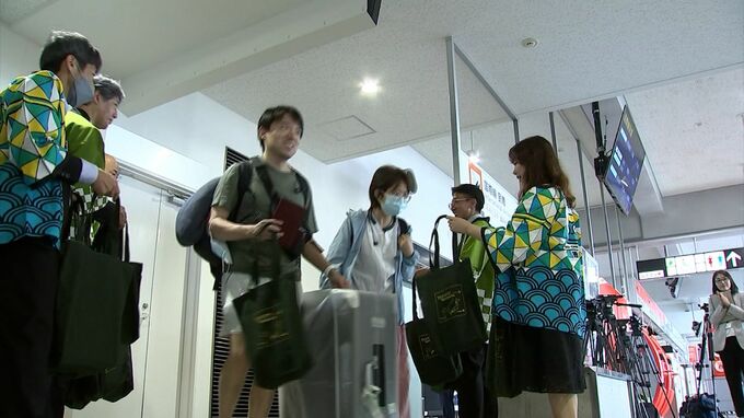 運行再開の初便は搭乗率50%にとどまりましたが、久しぶりに訪れた上海からの観光客らを観光協会などが出迎えました。