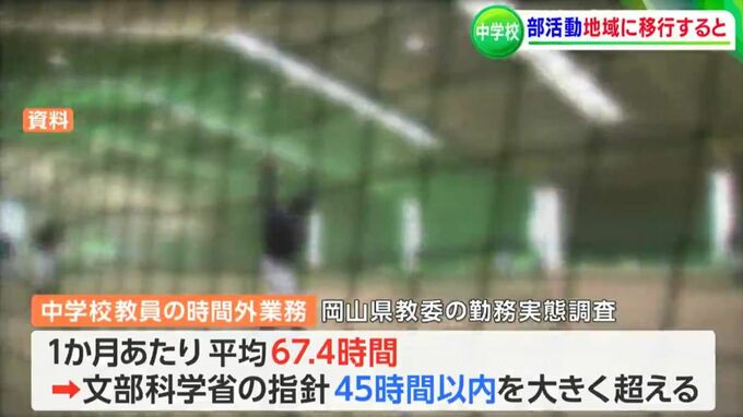 岡山県内の中学校の教員の時間外業務は、ひと月あたりおよそ67時間と、文部科学省の指針である月45時間以内を大きく超えています。