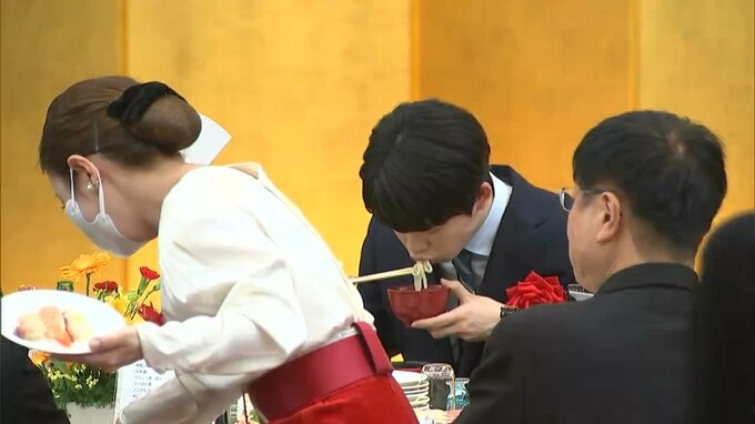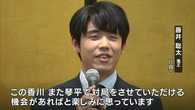 琴平町の旅館・琴参閣で、約250人の将棋ファンらに出迎えられた藤井聡太竜王です。竜王防衛を祝って祝賀会が開かれました。
