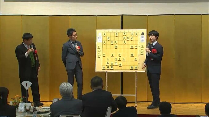 琴平町で予定されていた5局目がなくなったかわりに、ファンのために祝賀会が開かれたもので、大盤解説などが行われ竜王戦を振り返りました。