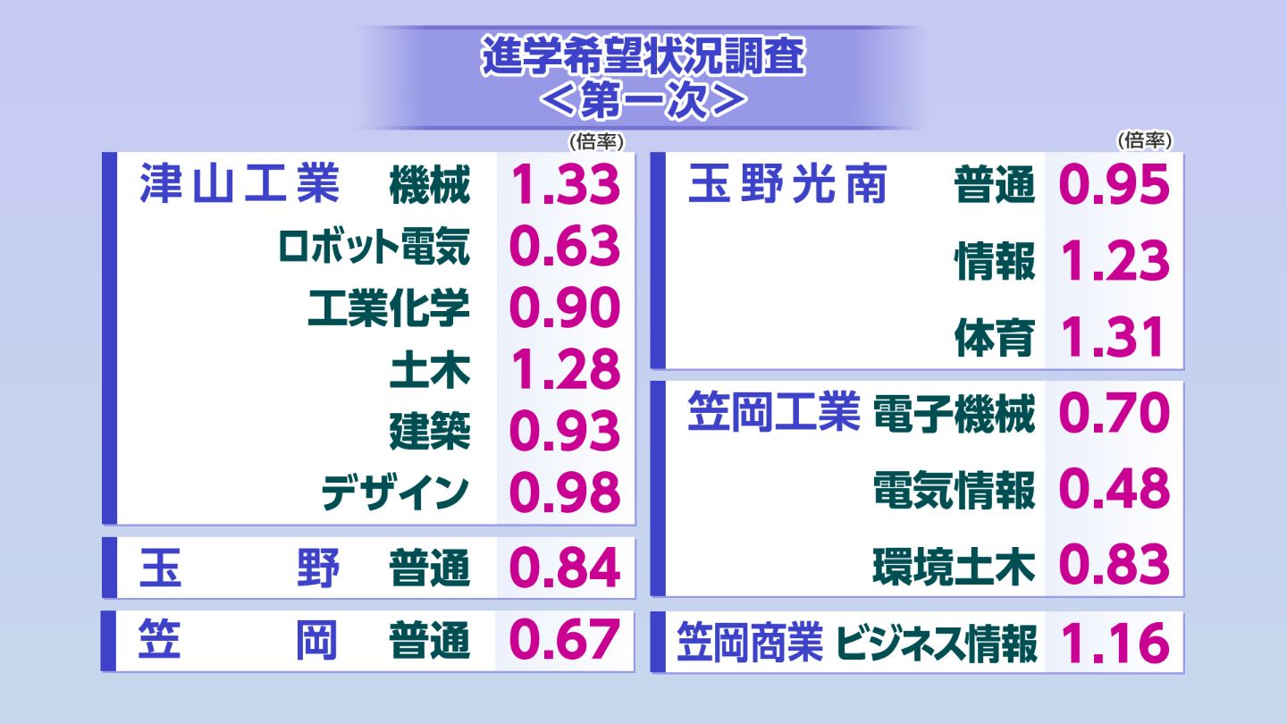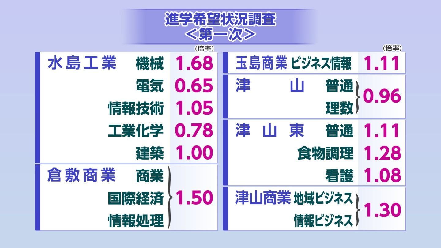 水島工業(機械)は1.68倍と高倍率、倉敷商業(国際経済)も1.50倍と高倍率です。津山(普通・理数)は定員を満たしていません。そのほかの学校・学科は【画像⑤】の通りです。