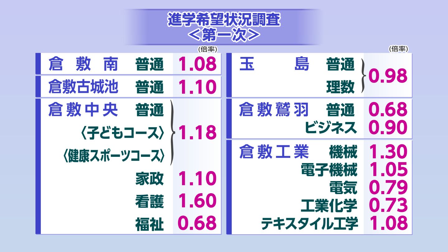 倉敷中央(看護)は1.60倍と高倍率。倉敷工業(機械)も1.30倍と高い倍率となっています。そのほかの学校・学科は【画像④】の通りです。