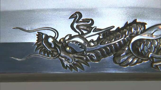 刀身には2匹の龍が彫られています。この大太刀は、刀工として活躍した逸見東洋が廃刀令を5年後に控えた1871年(明治4年)に倉敷市玉島中央町の羽黒神社に奉納したものです。