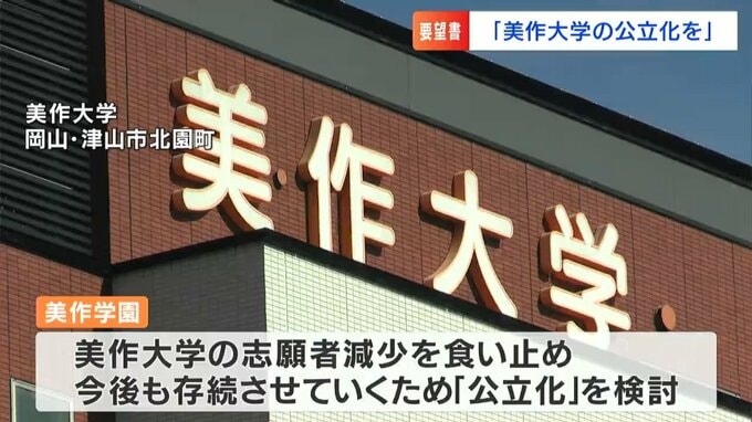 運営する学校法人・美作学園によりますと、美作大学は、少子化や大都市圏への進学志向などで年々志願者数が減少していて、「今後、大学の存続が危ぶまれる状況になることは明白だ」として、より志願者が集まる公立化を目指すことを決めたということです。