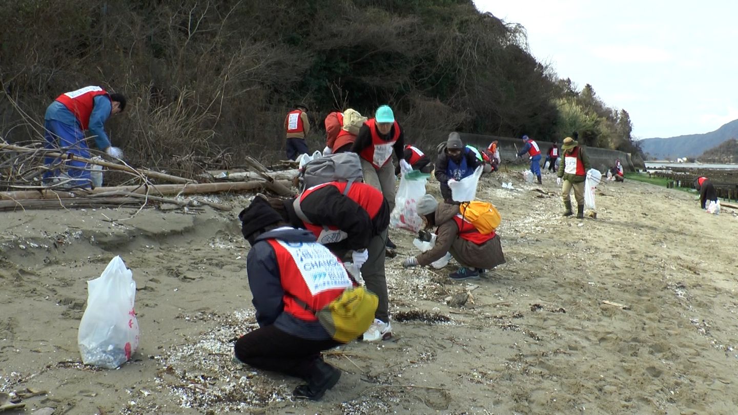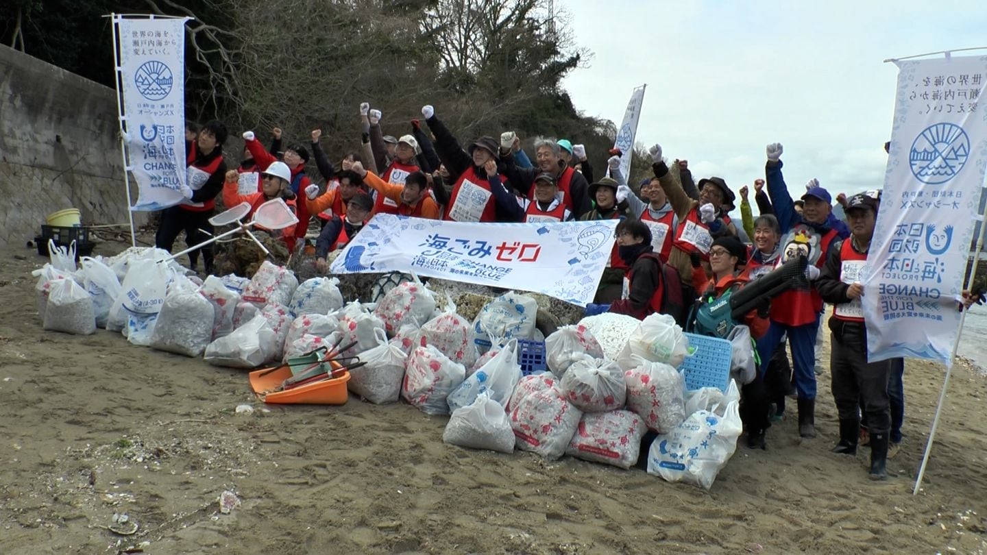 瀬戸内海の海ごみ問題を解決しようと、岡山・香川・広島・愛媛の4県が合同で海岸の清掃を行うイベントが広島県江田島(えたじま)市で開かれました。日本財団と、瀬戸内海に面する4つの県による「瀬戸内オーシャンズX」が開いたイベントです。