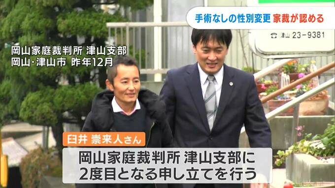 岡山県に住むトランスジェンダーの当事者が、生殖機能をなくす手術なしで戸籍上の性別変更を求めた申し立てに対して、岡山家裁津山支部は性別を変更することを認めました。