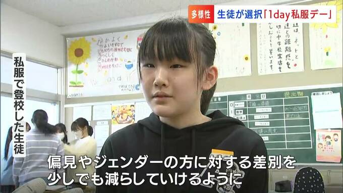 (私服で登校した生徒)「私服を着ることで自分らしさを表現することができ、とてもいい企画だと思います」「偏見やジェンダーの方に対する差別などを少しでも減らしていけるように私も努力していきたいなと思いました」
