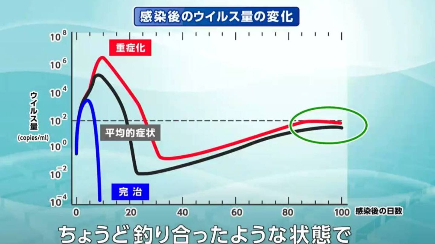 「時間かけて見てみるとウイルスがいったん下がっていくのだけれども、もう一回上がってしまって体の中でウイルスが共存すると。免疫細胞とやりとりしながらちょうど釣り合ったような状態で安定になってしまうという結果が出てきてしまった」