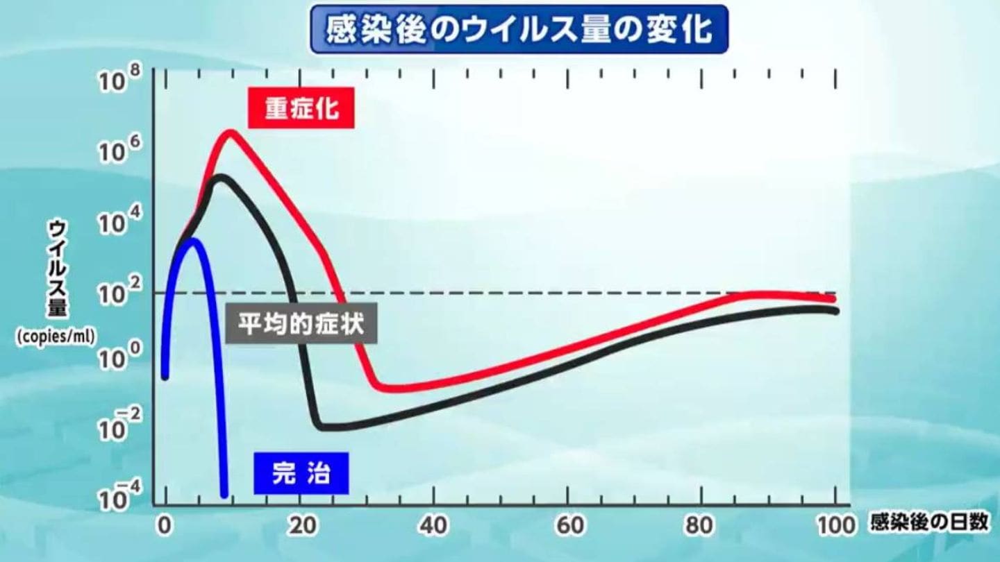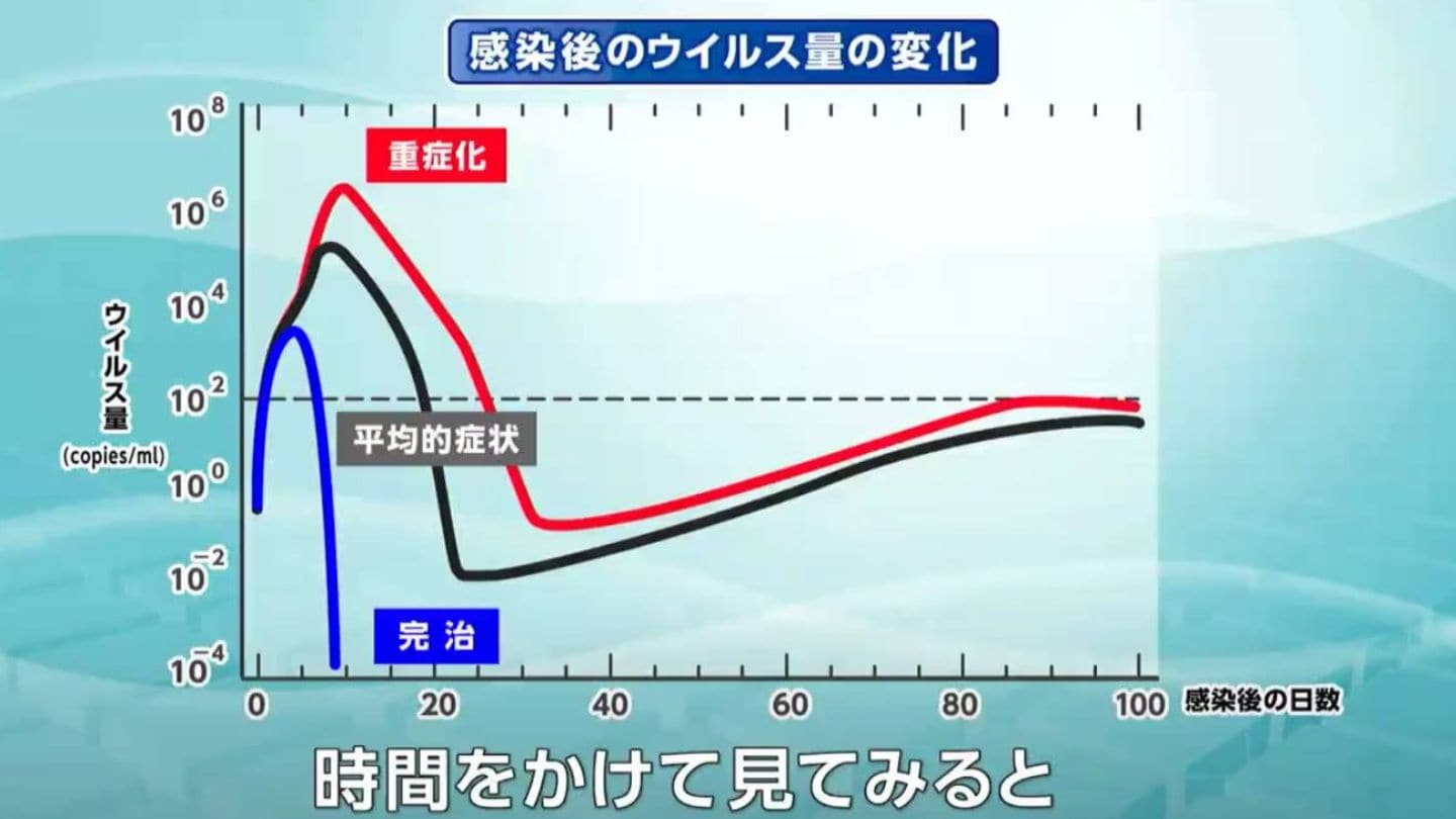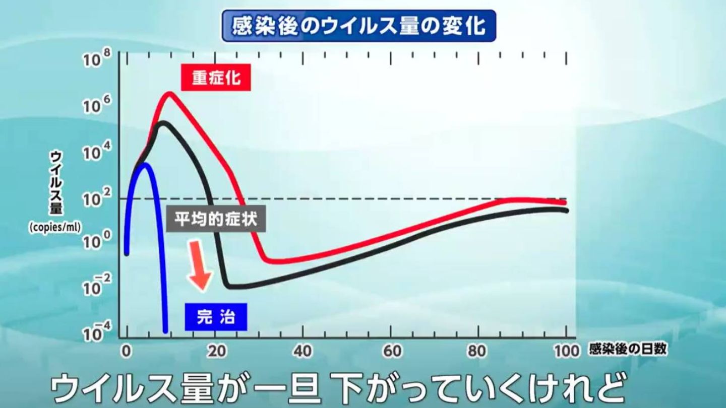 墨准教授らが作成した数理モデルでは、横軸に感染してからの日数、縦軸に体内のウイルス量を示します。赤い線は重症化した患者のウイルス量、黒は平均的な症状の患者、青は免疫力が高く完治する場合です。平均的な患者でもウイルスはゼロに向かっていません。