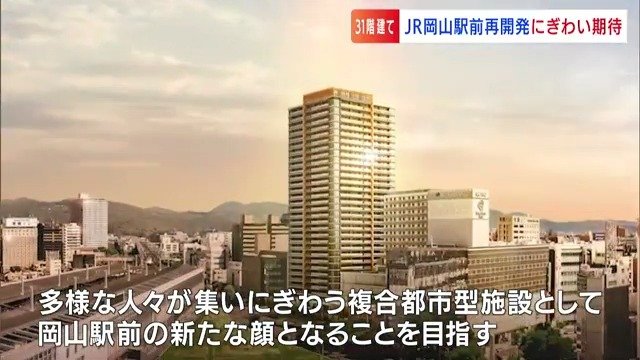 JR岡山駅のすぐ目の前「地上31階の大型マンション」建設へ 新幹線「のぞみ」停車駅 周辺のにぎわい創出に期待 2024年2月14日(水) 17:25 岡山 岡山の玄関口に大型マンションです。JR岡山駅前に建設予定の地上31階建てのマンションの概要説明会が開かれました。再開発が進められている駅周辺のにぎわいの創出も期待されています。(野村不動産常務執行役員 …
