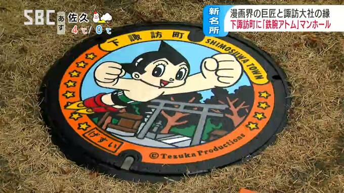 鉄腕アトムが諏訪大社のお膝元に…鳥居の前を飛ぶ雄姿とお茶の水博士とのツーショット、マンホールの蓋になってお目見え、手塚治虫さんの先祖の縁で実現 2024年2月21日(水) 21:30 国内 漫画家・手塚治虫(てづか・おさむ)さんの名作「鉄腕アトム」の主人公・「アトム」をデザインしたマンホールのふたが、21日、長野県下諏訪町に設置されました。下諏訪町の諏訪大社下社秋宮(しもしゃあきみや)に…