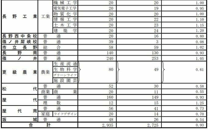 普通科以外では松本県ケ丘の自然探究・国際探究が2.75倍、飯田の理数科が2.58倍、長野西の国際教養と伊那北の理数科が2.25倍でした。