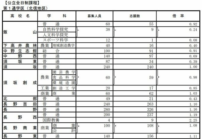 普通科で倍率が高かったのは、長野西が1.19倍、松本蟻ケ崎が1.18倍長野が1.16倍。