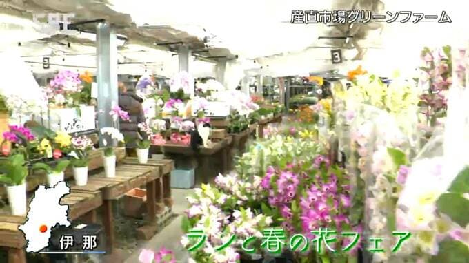伊那市の直売所で開かれている「ランと春の花フェア」は、春の訪れを感じてもらおうと毎年開催されていて、100種類、2,000鉢のランのほか、チューリップやアネモネなどおよそ100種類が販売されています。