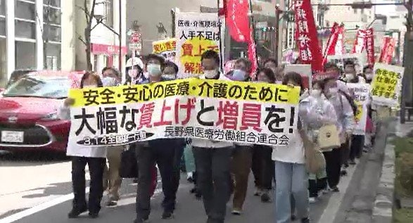 「忙しくて目の前の業務をこなすだけで精一杯…」医療現場から切実な声「疲れる」が9割超「震災や感染症に対応できない…」看護師や介護職員らが人手不足の解消や賃上げ求めデモ行進 2024年3月14日(木) 17:38 国内 新年度を前に、長野県内でも春闘に向けた動きが加速しています。医療従事者などが加盟する労働組合が14日、各地で街頭活動を行い、人手不足の解消と賃上げを求めました。「医師・看護師を増やせ!介護職員を増やせ…