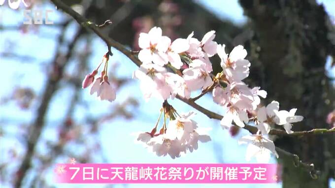3月末から気温の高い日が続いた影響で、天龍峡のソメイヨシノは一気に開花が進み、3月31日に基準木の開花が宣言されました。
