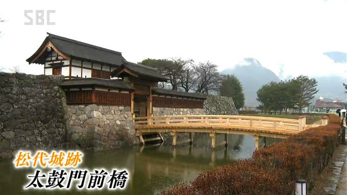 老朽化が進んでいた長野市の松代城跡(まつしろじょうせき)にある太鼓門前の橋の架け替え工事が終わり、渡り初め式が行われました。