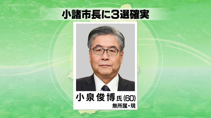 【速報】小諸市長選挙・現職の小泉氏が3選確実 2024年4月7日(日) 20:00 国内 小諸市長選挙信毎開票速報~SBC~ 7日に投票が行われた小諸市長選挙は、現職の小泉俊博(こいずみ・としひろ)さん60歳が、3回目の当選を確実にしました。