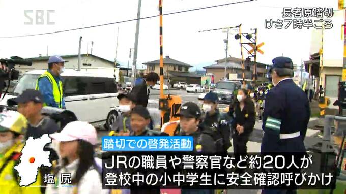 塩尻市広丘吉田の踏切では12日朝、JRの職員や警察官などおよそ20人が、登校中の小中学生に安全確認を呼びかけました。