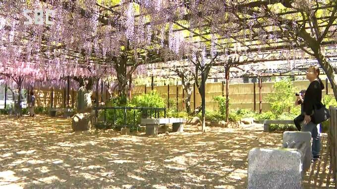紫やピンク、それに白い花が藤棚から流れ落ちるように咲き誇り、訪れた人がカメラやスマホを向け楽しんでいました。