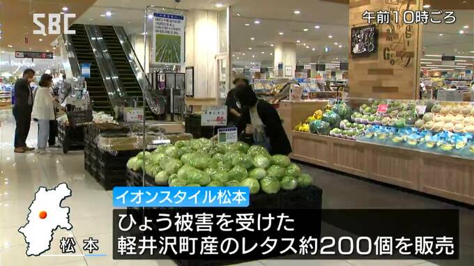 イオンモール松本の食品売り場に設けられた特設コーナーには10日、ひょうの被害を受けた軽井沢町の畑で収穫されたレタス、およそ200個が並びました。
