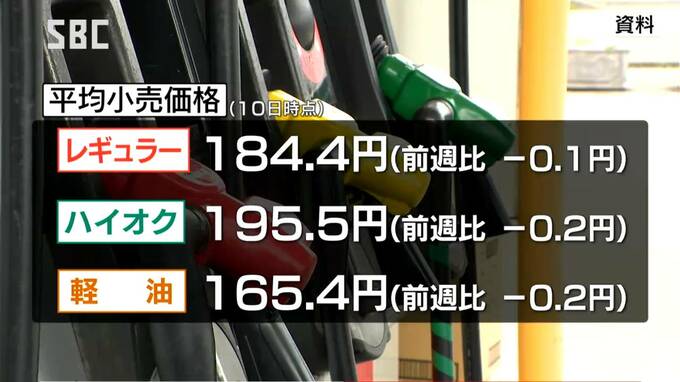 資源エネルギー庁によりますと、今週の県内のガソリン1リットルあたりの平均小売価格は、レギュラーが先週に比べ0.1円安い184.4円、ハイオクが0.2円安い195.5円となりました。